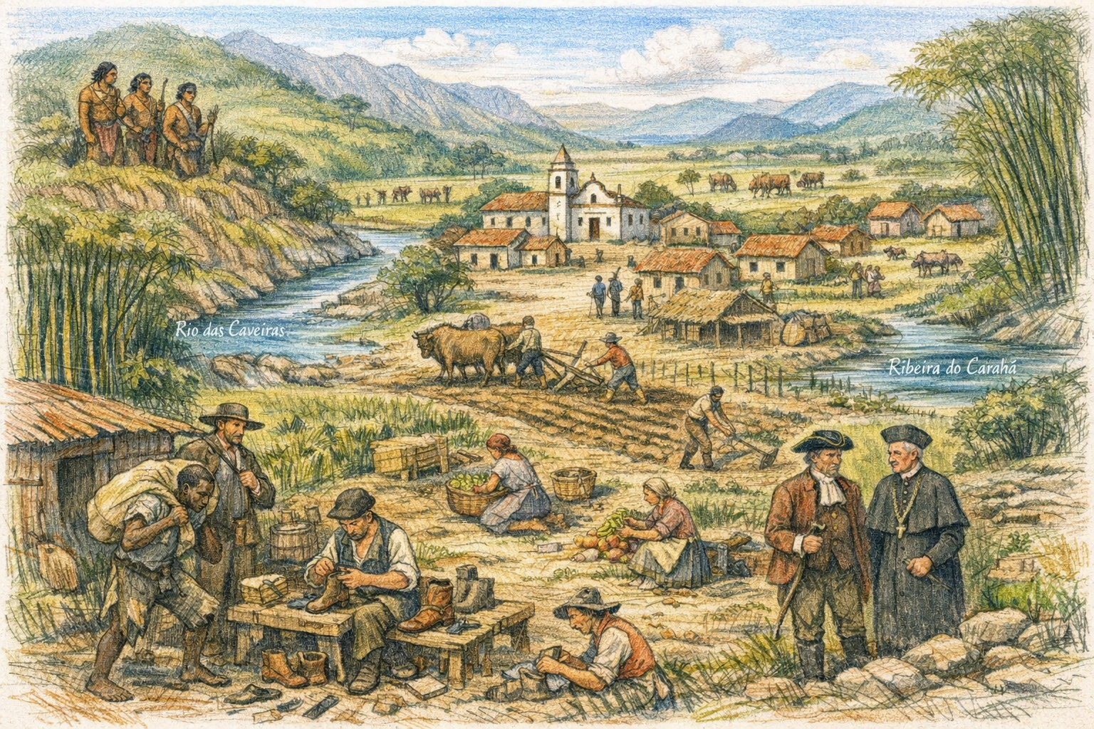Esse diagnóstico se confirma ao observarmos o recenseamento de 1798, que revela uma sociedade essencialmente rural, de subsistência e profundamente desigual. A estrutura ocupacional era composta por apenas 3 magistrados e oficiais públicos e 1 clérigo, enquanto a economia reunia 8 negociantes, 7 roceiros de mantimentos e 17 fazendeiros voltados à criação de animais. O setor artesanal contava com apenas 4 sapateiros e 4 carpinteiros.