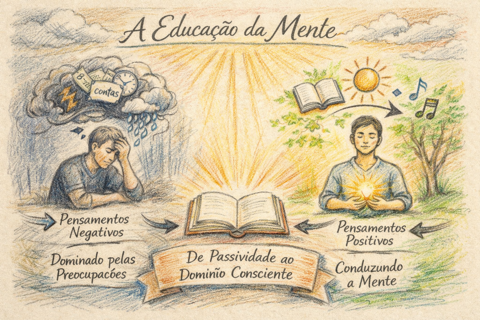 Essa diferença, aparentemente simples, representa uma transformação profunda: sair da passividade mental para o domínio consciente.